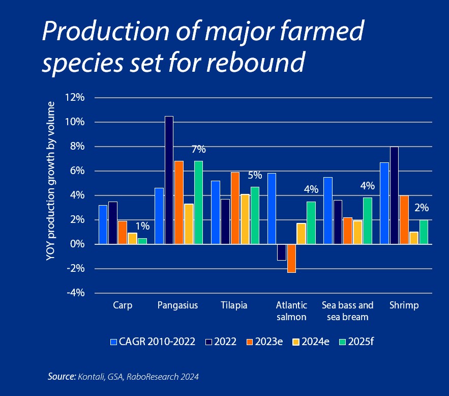 Global aquaculture industry to see steady growth in 2025 (Photo: RaboResearch) A new report from RaboResearch states that the global aquaculture industry should see improved production growth for certain species in 2025.